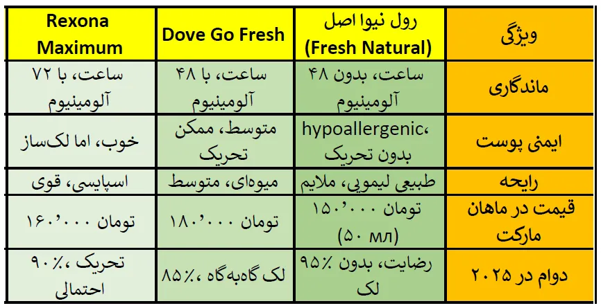 شما گزینههای زیادی دارید، اما رول ضدتعریق نیوا چطور با رقبا مثل Dove یا Rexona مقایسه میشود؟ بیایید جدولی شفاف ببینیم: